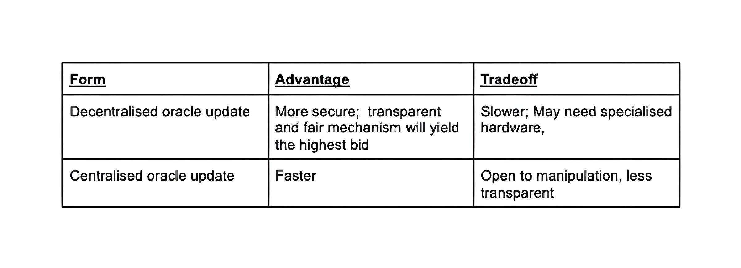 We would expect purpose-built or “official” extensions to existing oracles to perform better due to less latency versus what would be required to run third party logic in addition to the upstream oracle. Additionally, these would be much more attractive from a risk perspective, as in the case of third party infrastructure, updates could break undesired integrations spontaneously.