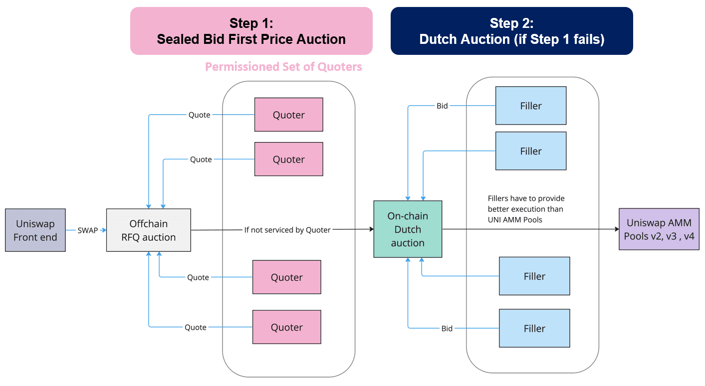 To determine an appropriate starting price for the subsequent Dutch auction, UniswapX conducts a sealed bid first price auction among a selected group of ‘Quoters’ through an offchain Request For Quote (RFQ) system. The Quoters are chosen by Uniswap Labs based on their expertise and track record.